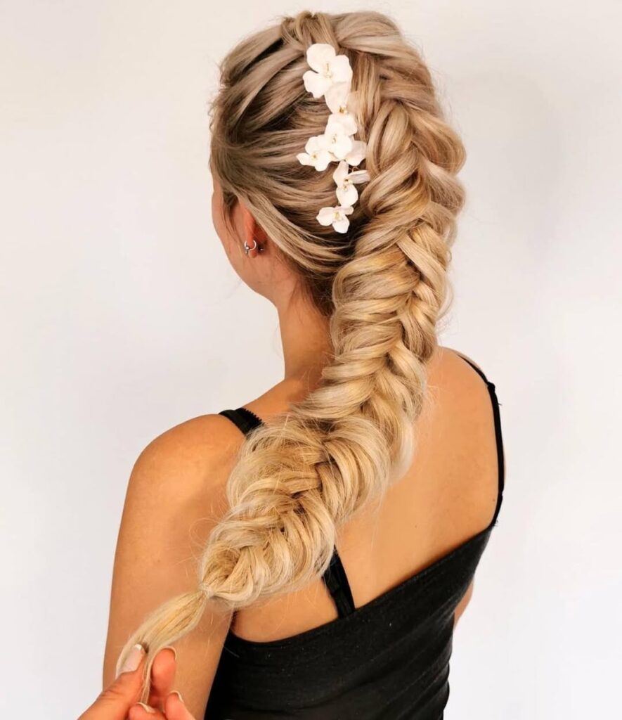 The fishtail crown braid wraps around the head like a halo, giving a soft, fairy-tale look. It’s elegant, feminine, and eye-catching.